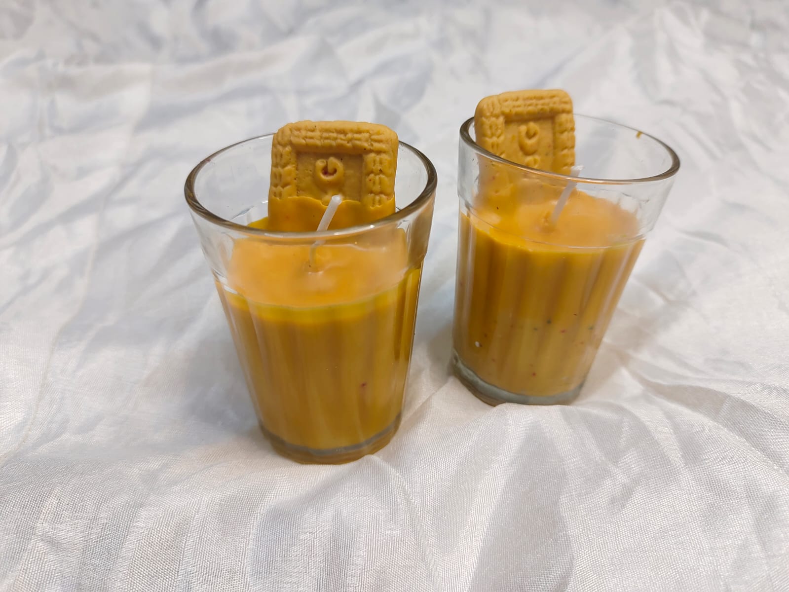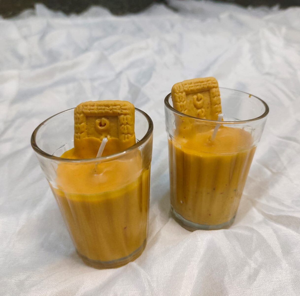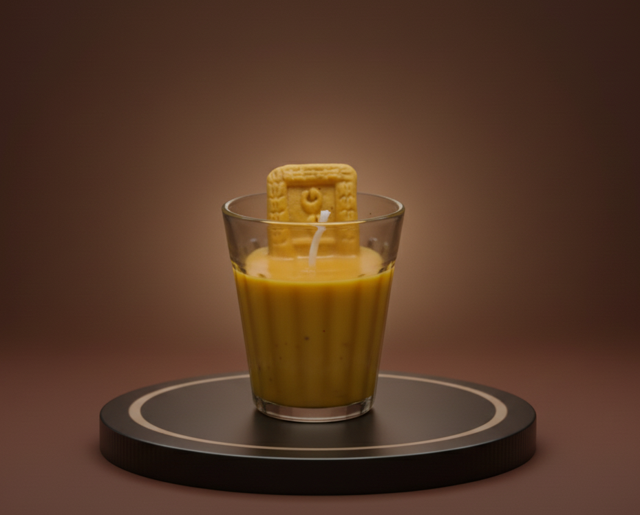 - The Biscuit: To complete the scene, each candle is topped with a realistic parle-G style biscuit-shaped wax embed positioned perfectly for that “dunked” look.