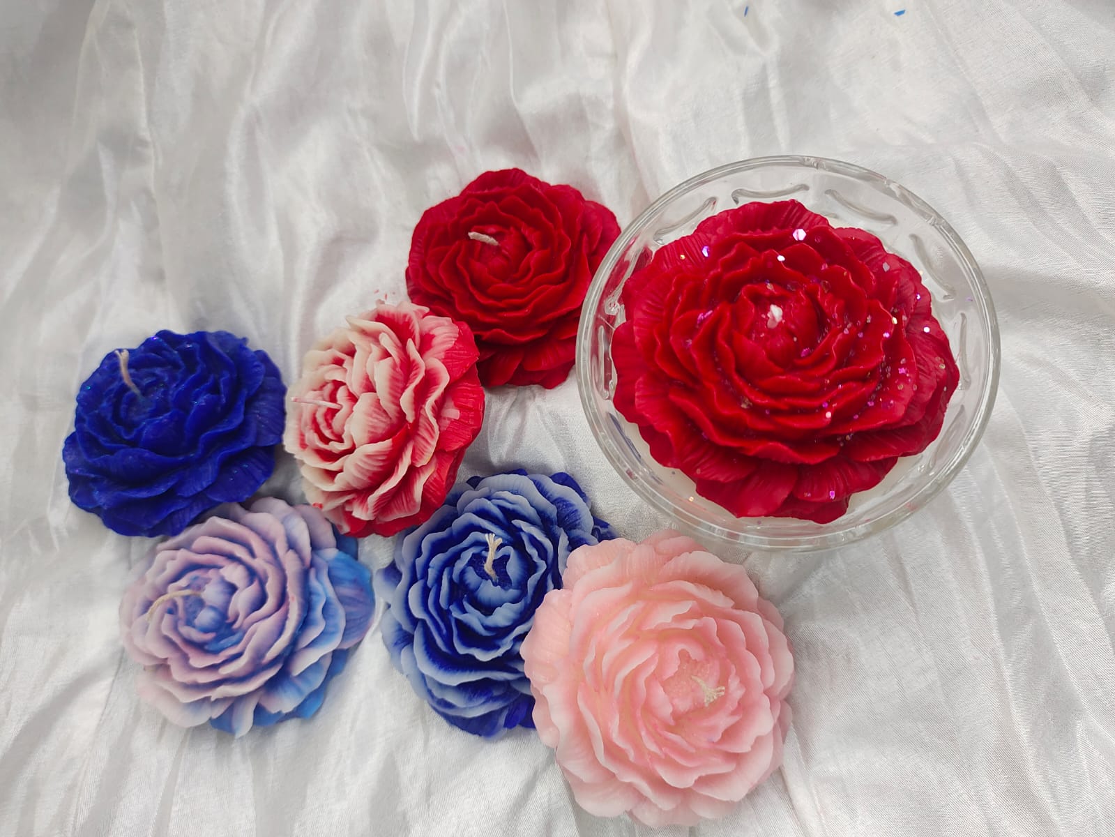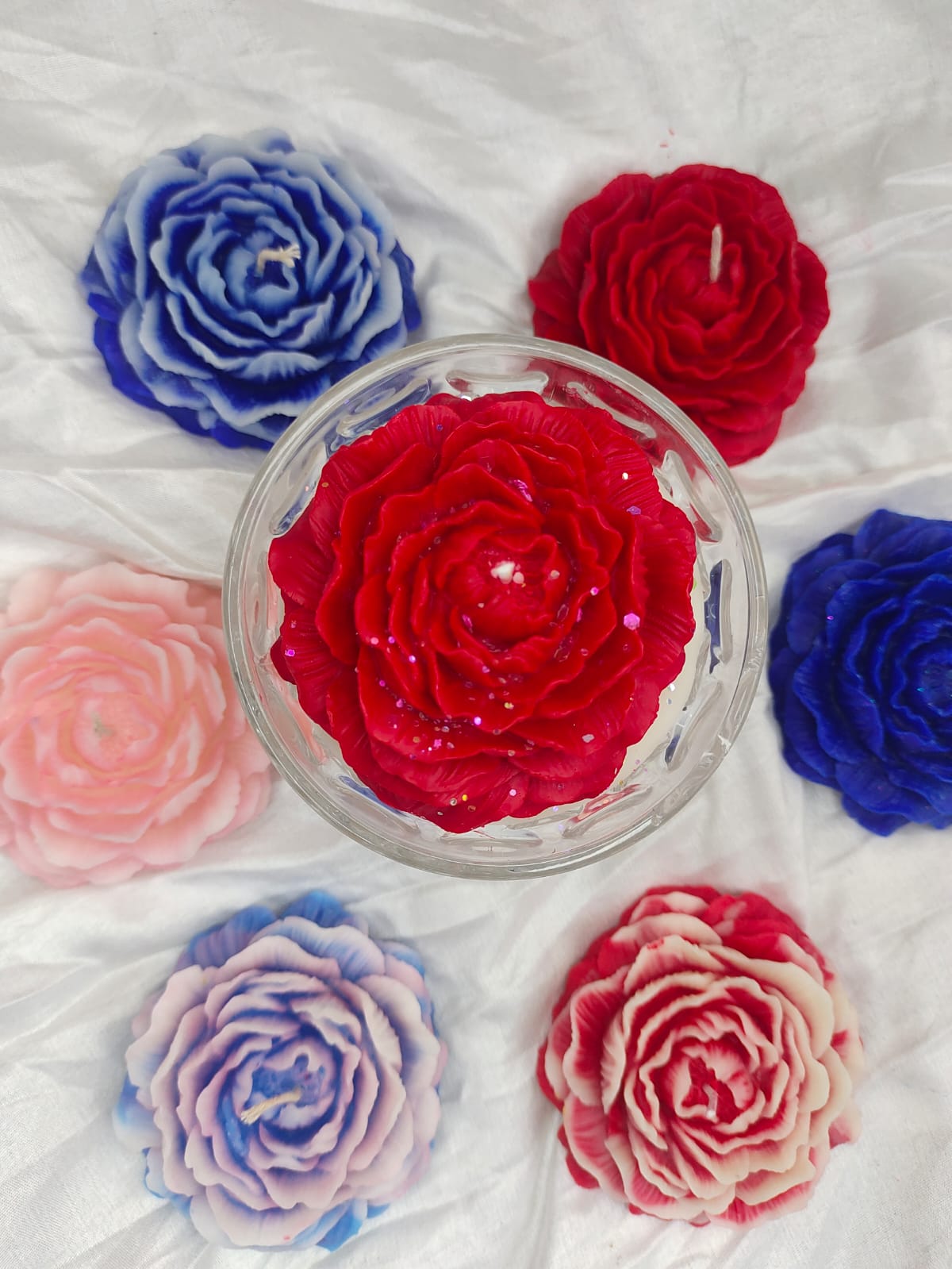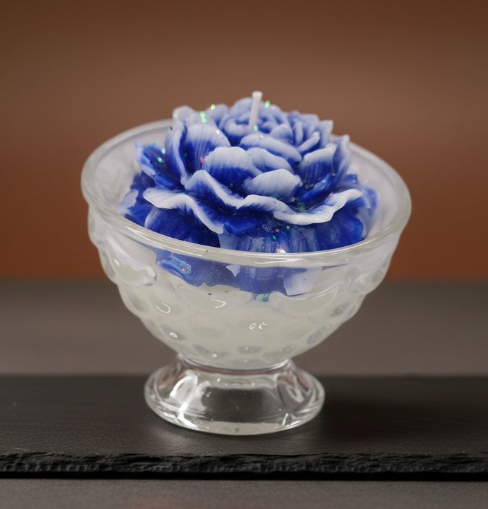 Elevate your home decor with this magnificent, artisan-crafted candle. It is a stunning blend of visual art and captivating fragrance. The candle itself is meticulously shaped like a fully bloomed large Peony or Rose, with intricate detailing on every petal, making it a true showstopper. It is elegantly secured in a clear, decorative glass jar/bowl that amplifies the warm glow when lit.