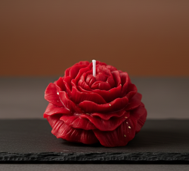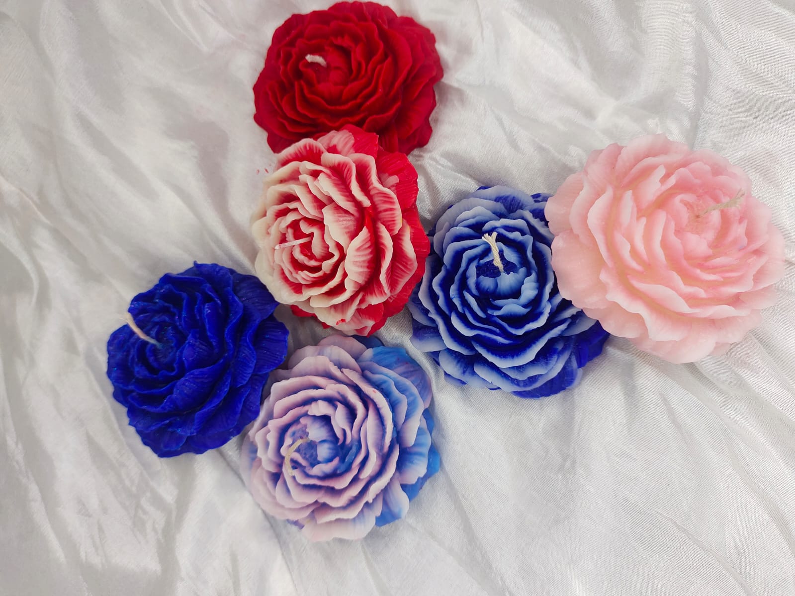 This is an exquisite and colorful set of six botanical candles, each meticulously crafted in the shape of a large, open rose or peony flower. The beauty of this collection lies in its highly detailed texture, where every layer of the petal is clearly defined, giving the candles a beautiful realistic, three-dimensional look.