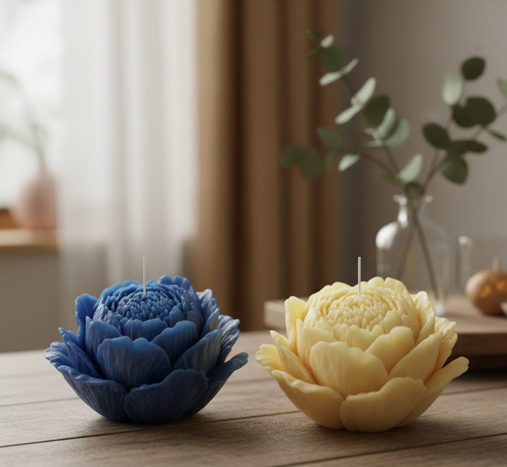 A vibrant collection of flower-shaped candles featuring an array of colors including deep blue, dual-toned blue-pink, red, and soft pink. Each candle boasts intricate detailing that mimics real rose or peony petals, making them stunning decorative pieces.