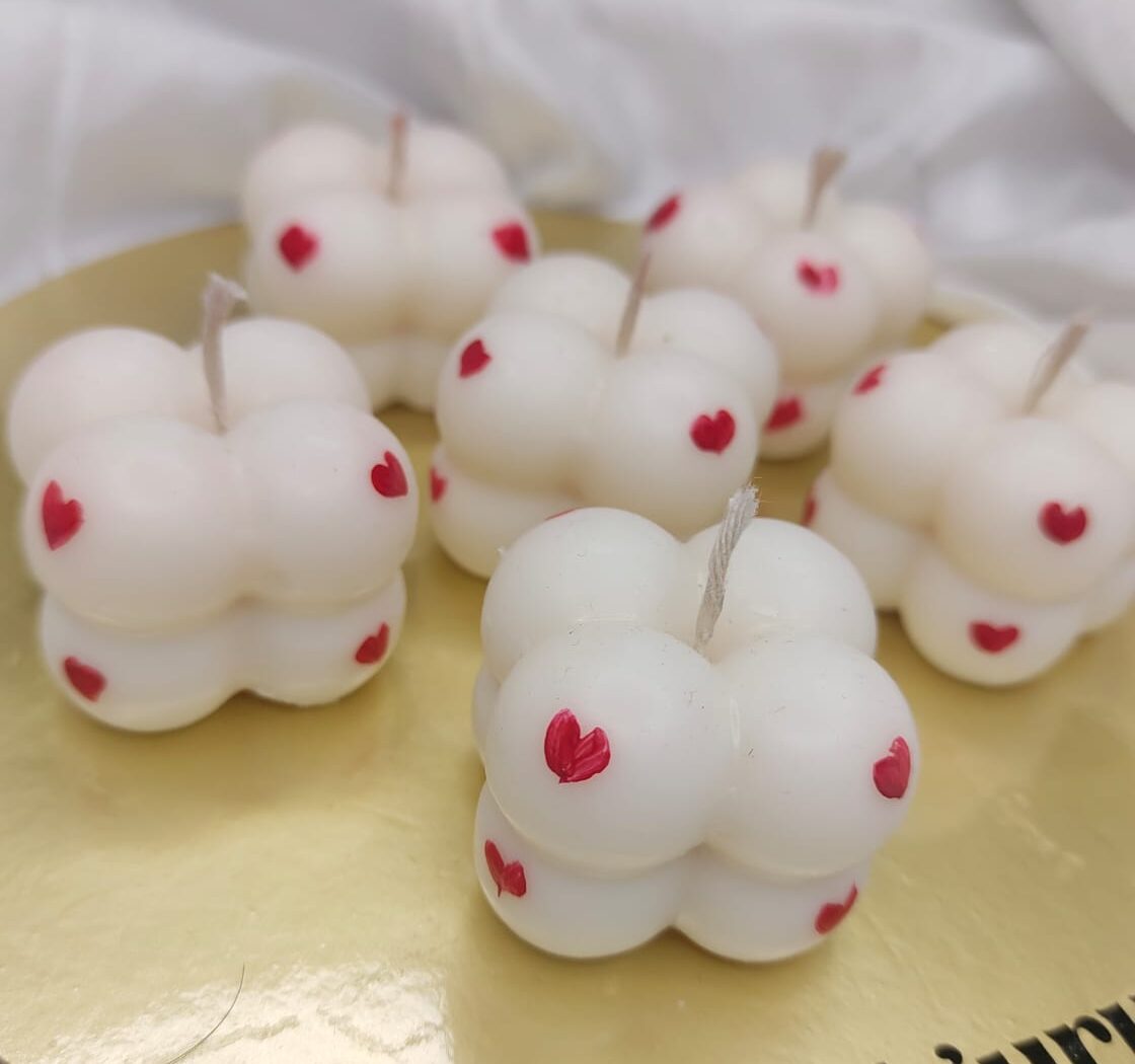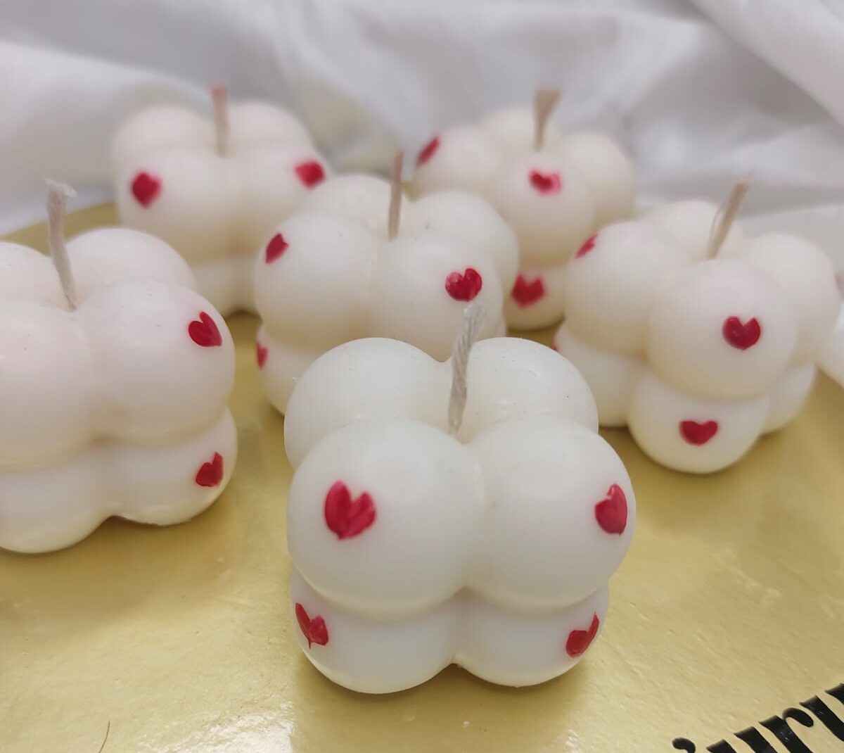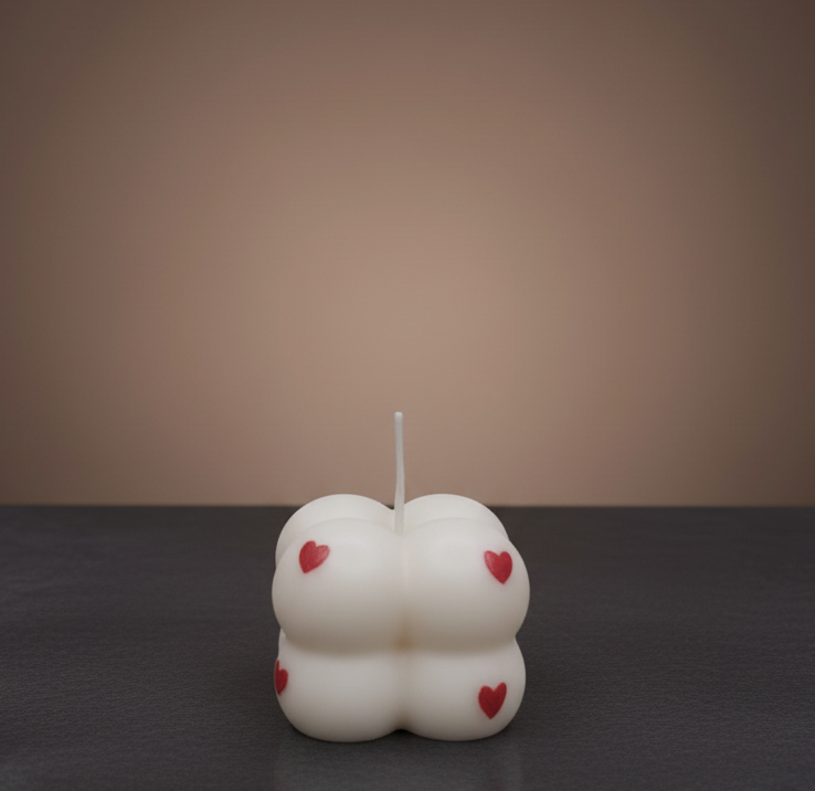 Each candle in this enchanting collection is meticulously crafted in a trendy, multi-sphere “bubble cube” shape, offering a contemporary aesthetic. Made from pristine white wax, their smooth, matte finish provides a perfect canvas for the playful embellishment of tiny, hand-painted red hearts scattered across their surfaces.