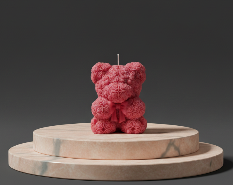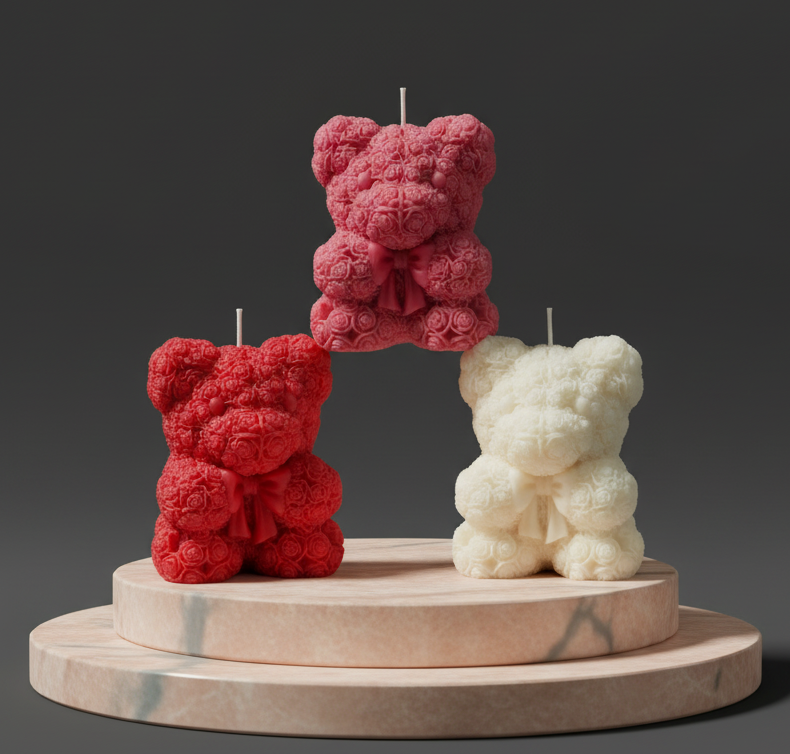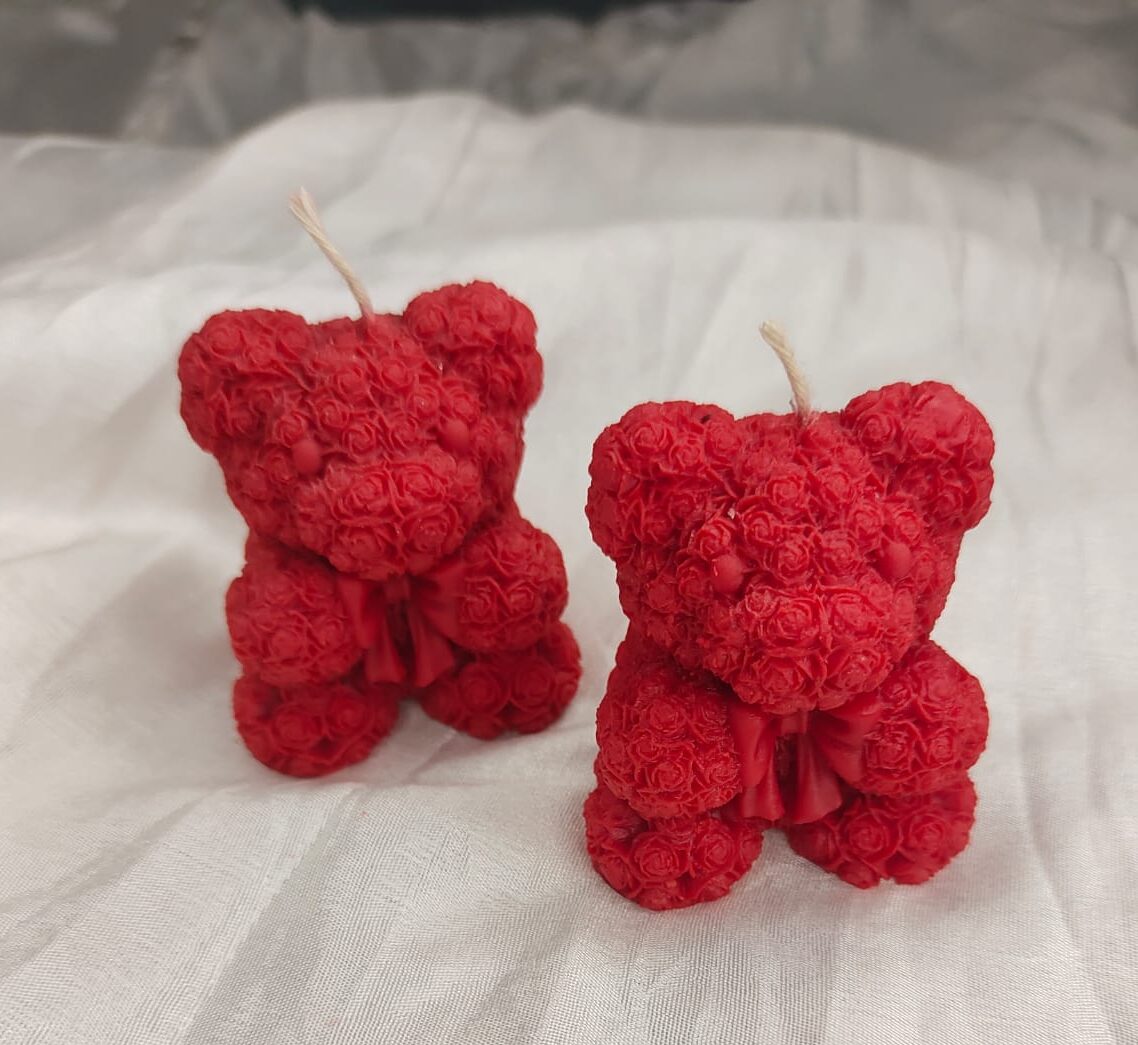 These are a pair of exquisitely crafted deep red teddy bear-shaped candles, perfect for adding a romantic and charming touch to any space. The surface of each bear is intricately textured, giving the illusion that it is completely covered in hundreds of tiny, delicate rosebuds. This unique, floral relief design is what makes these candles so special and appealing.